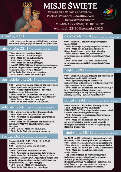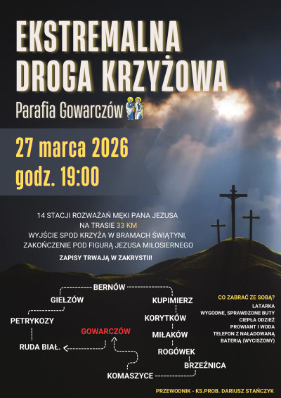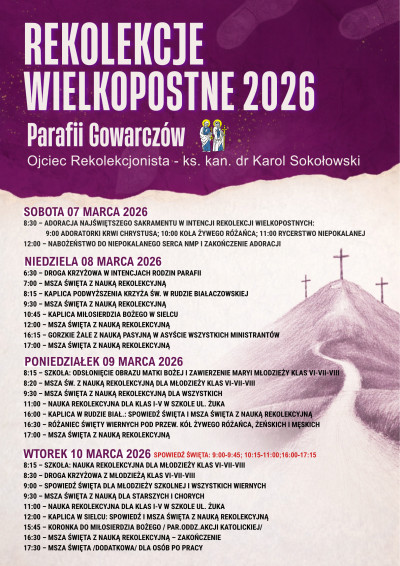 - W przyszłą niedzielę 26 kwietnia na Mszy św. o godz. 9:30 dzieci przystępujące do I-Komunii św. będą składać, od siebie i swoich Rodziców, ofiarę dobrowolną w kopertach, jako Dar Wdzięczności dla Ołtarza, z czego będzie ofiarowany 17 maja podczas I-Komunii św. specjalnie wyszyty dla naszej parafii Ornat z cudownym wizerunkiem MB Gowarczowskiej.